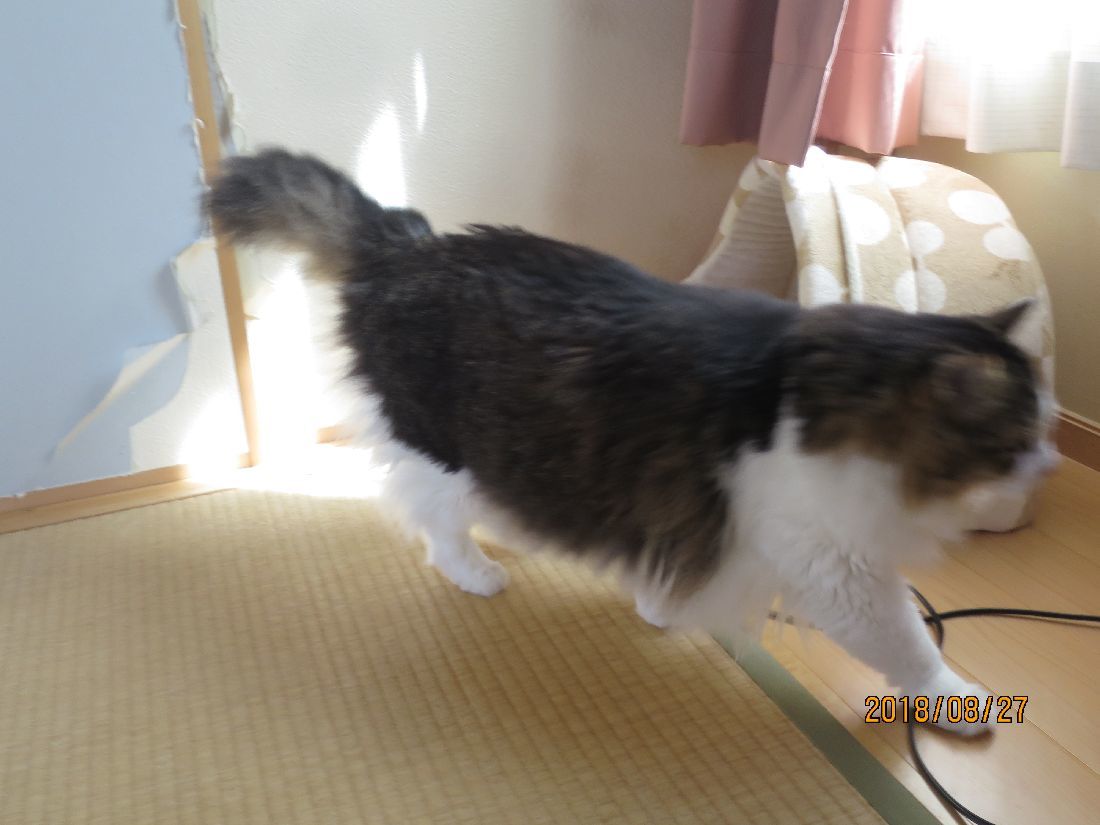 朝、まるがほんのちょっとだけ寝坊すると、ふうちゃんがひなたぼっこから出てきました。