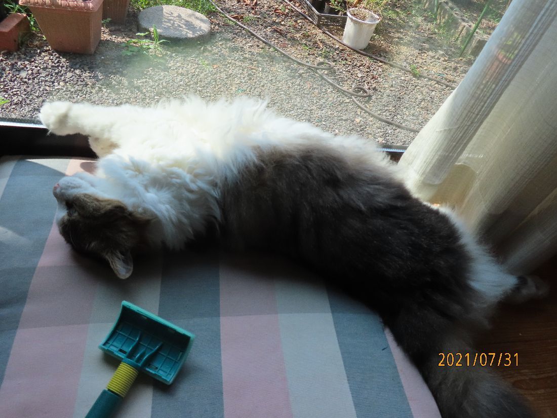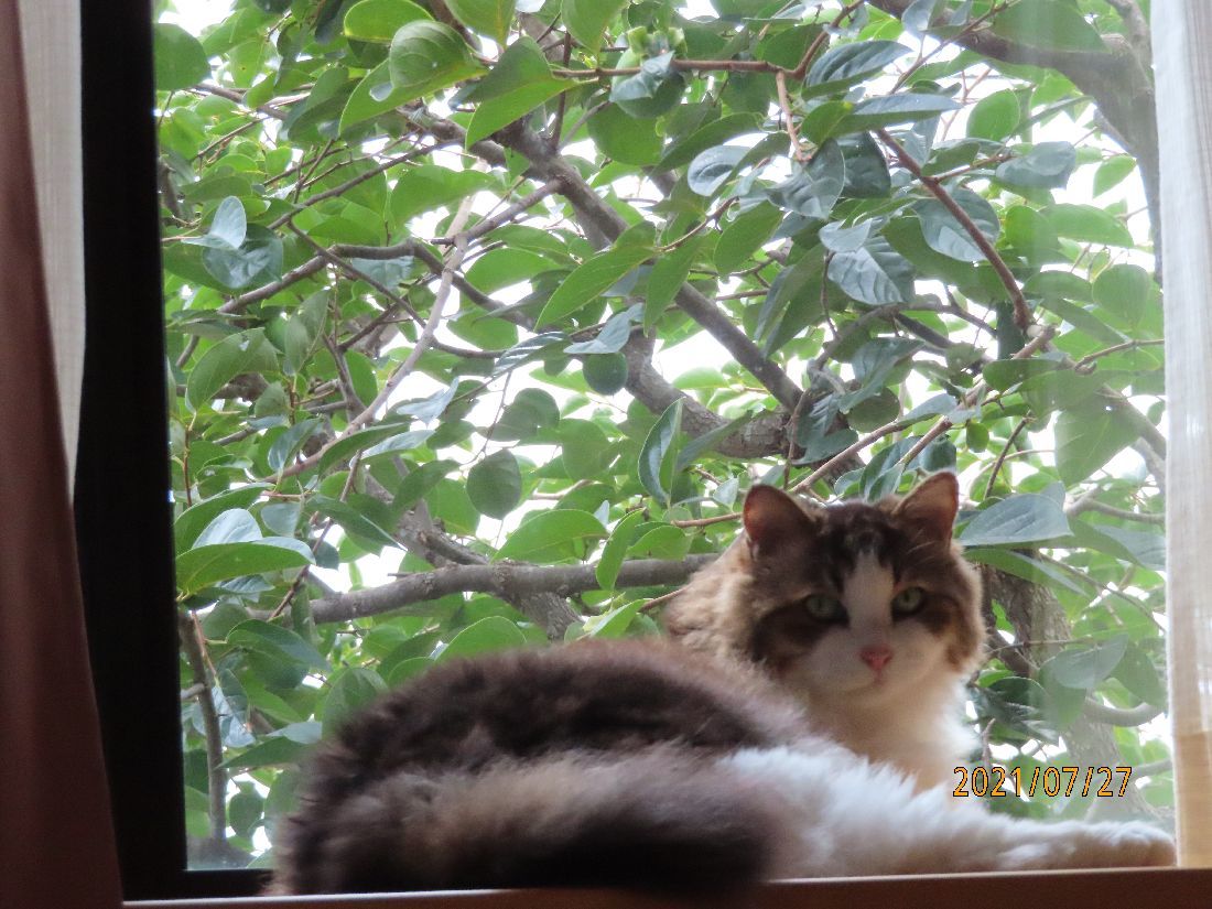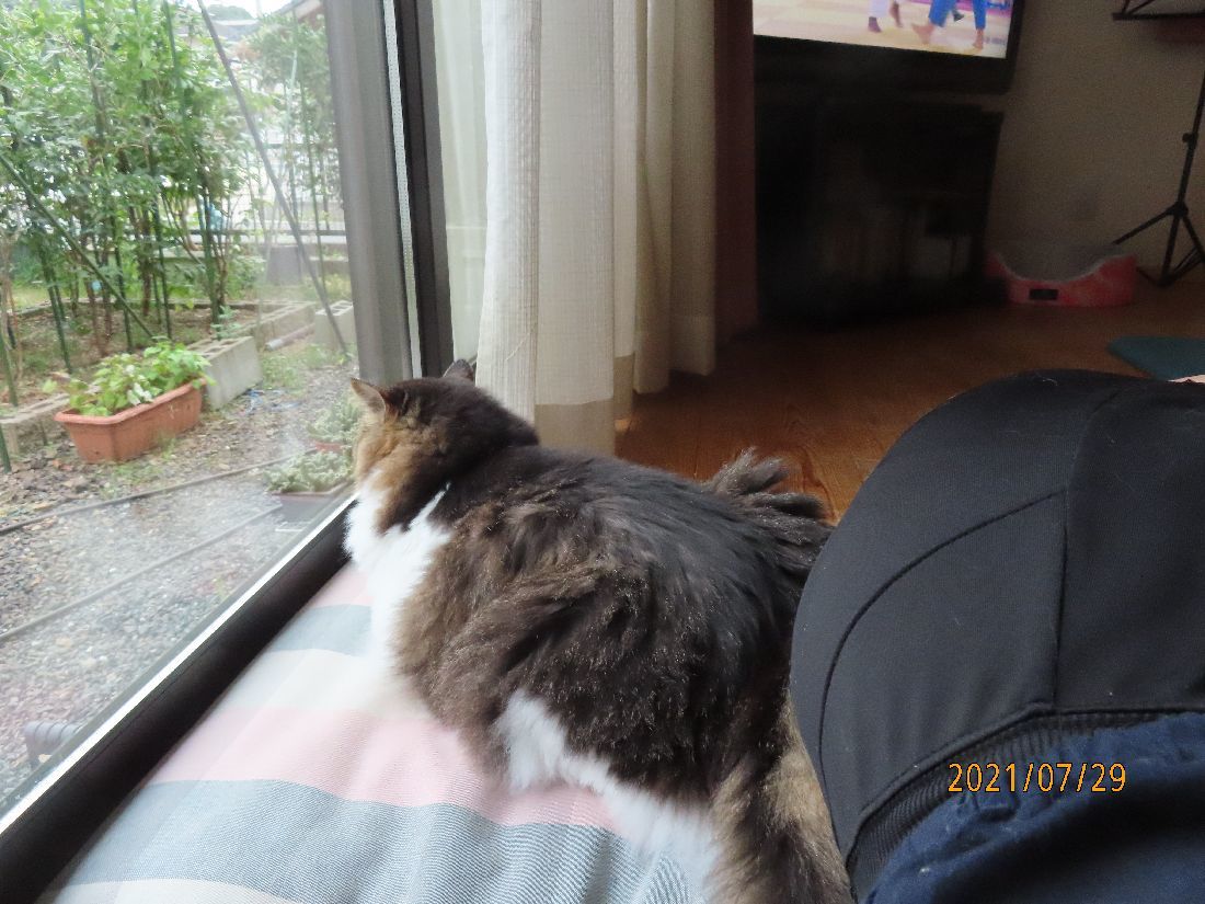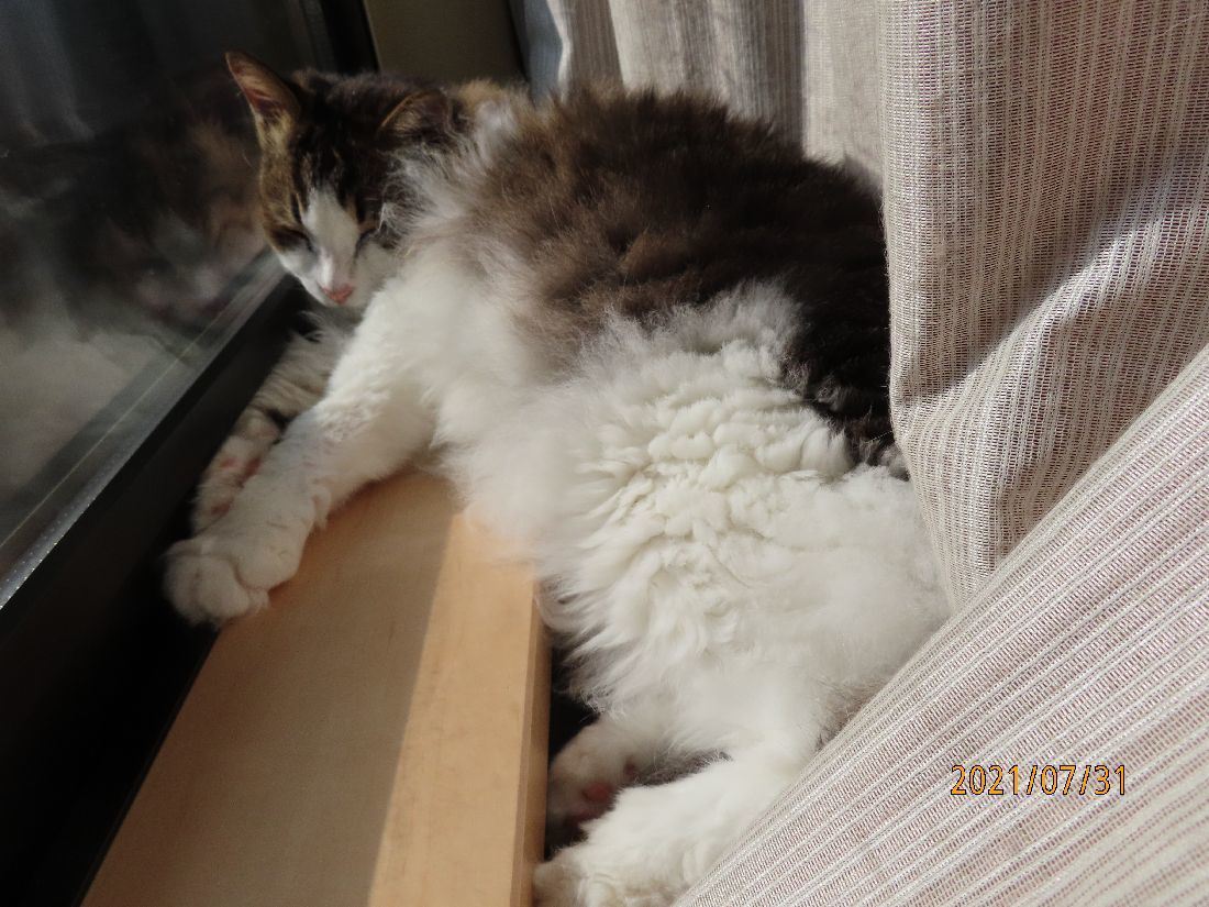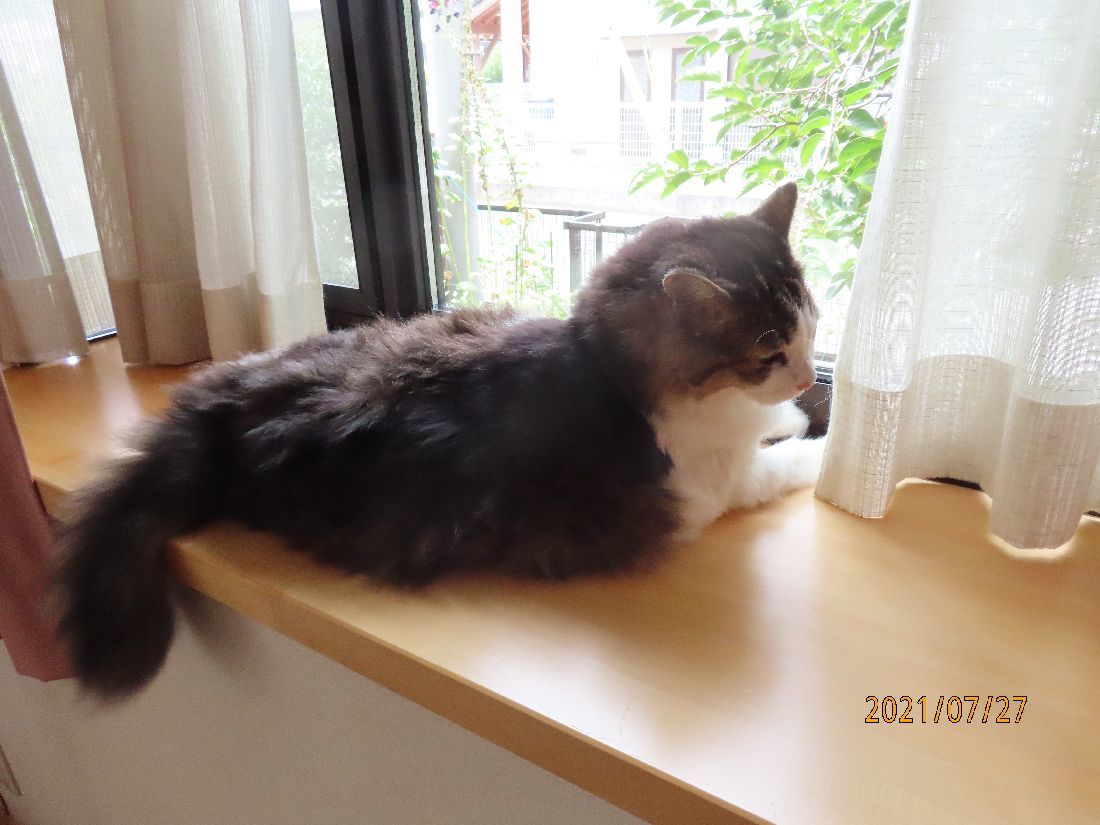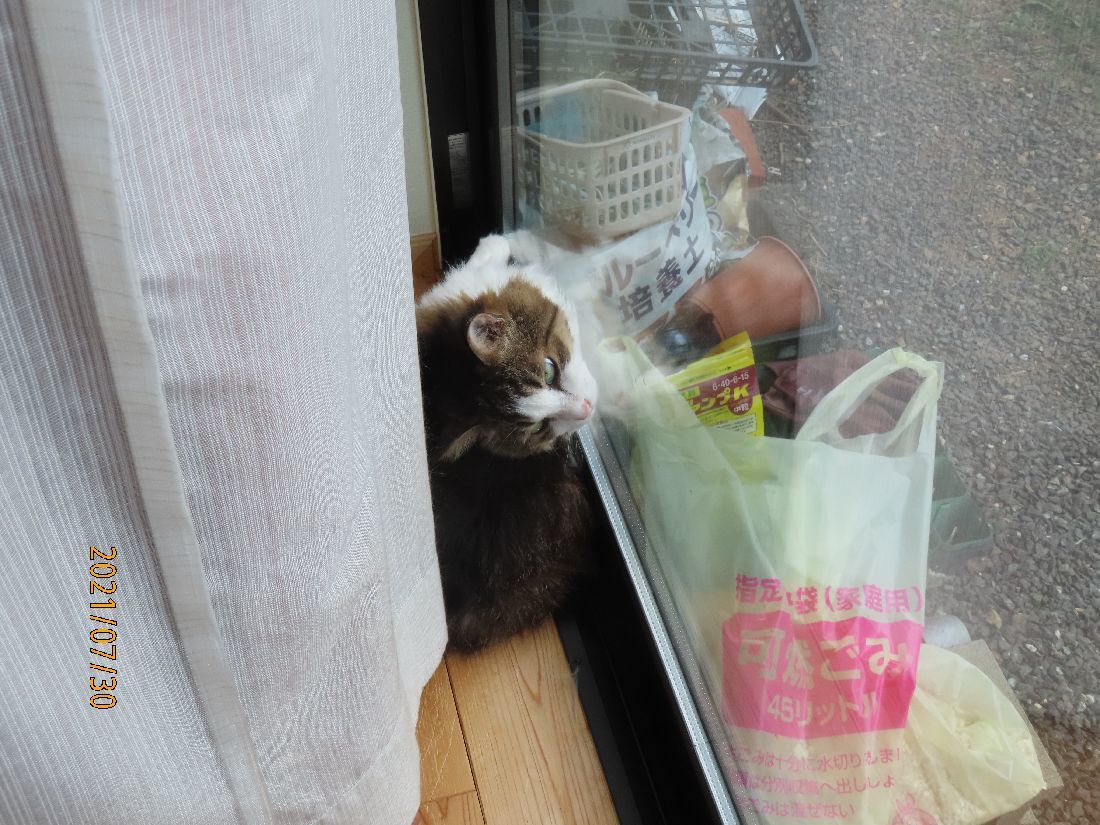ブラッシングが済むとカーテンの陰から外を見ています。