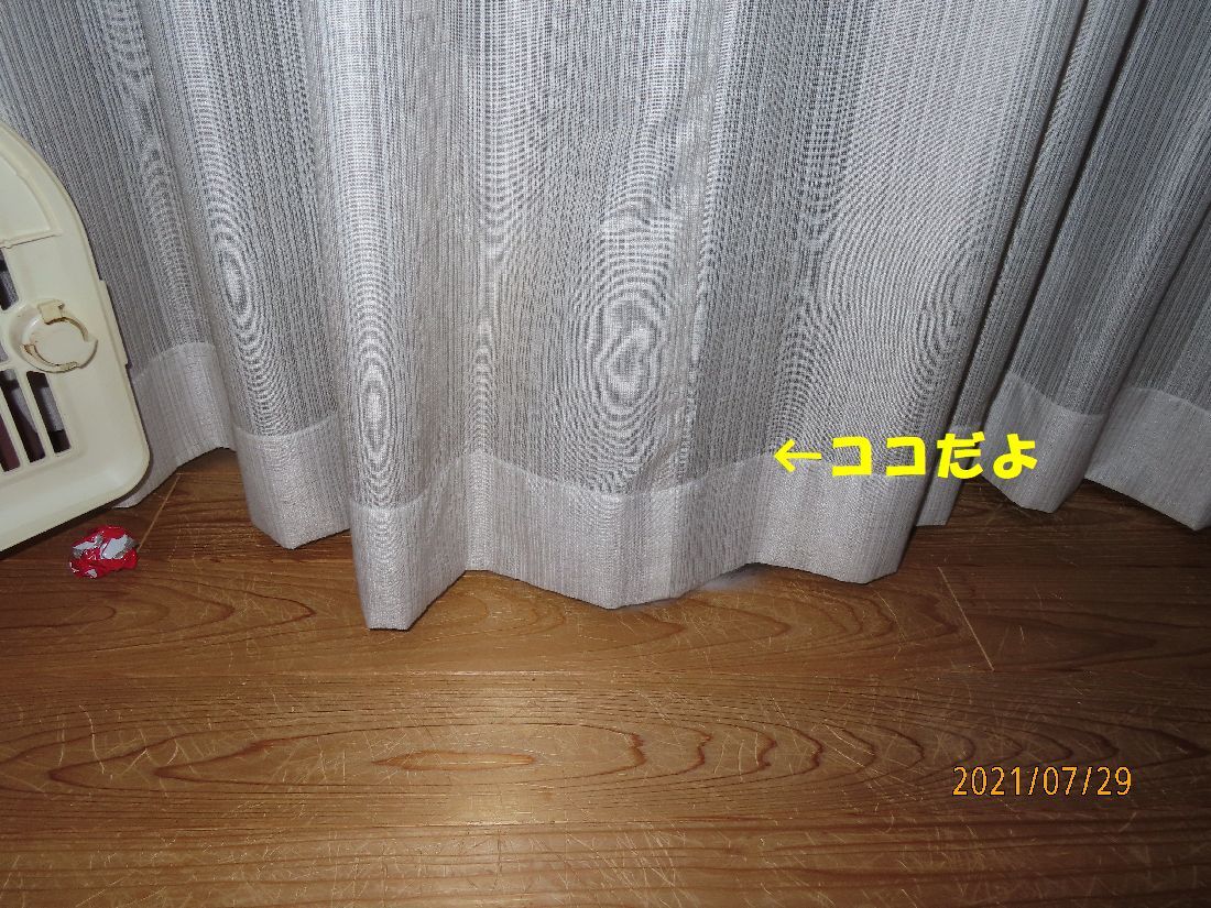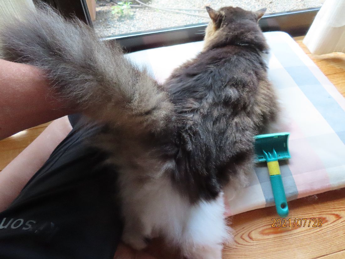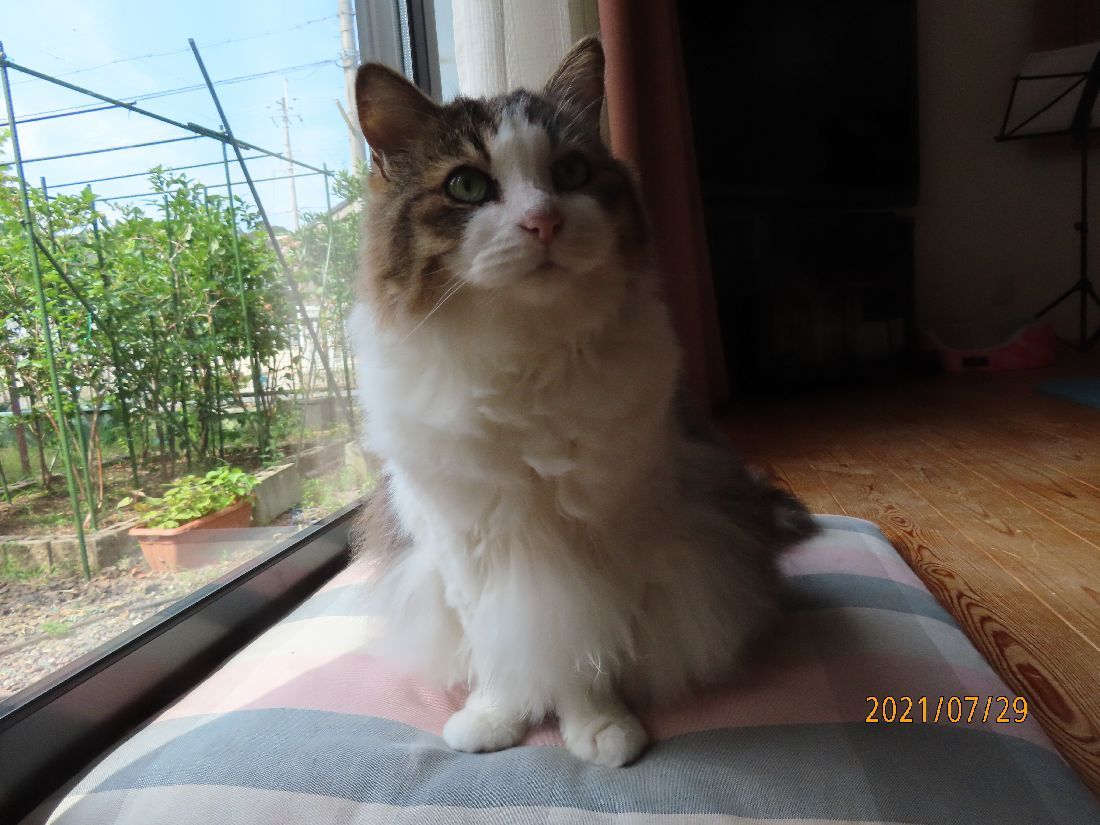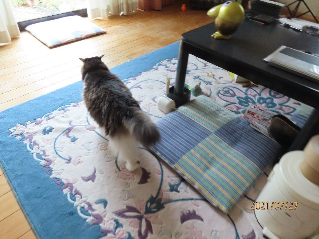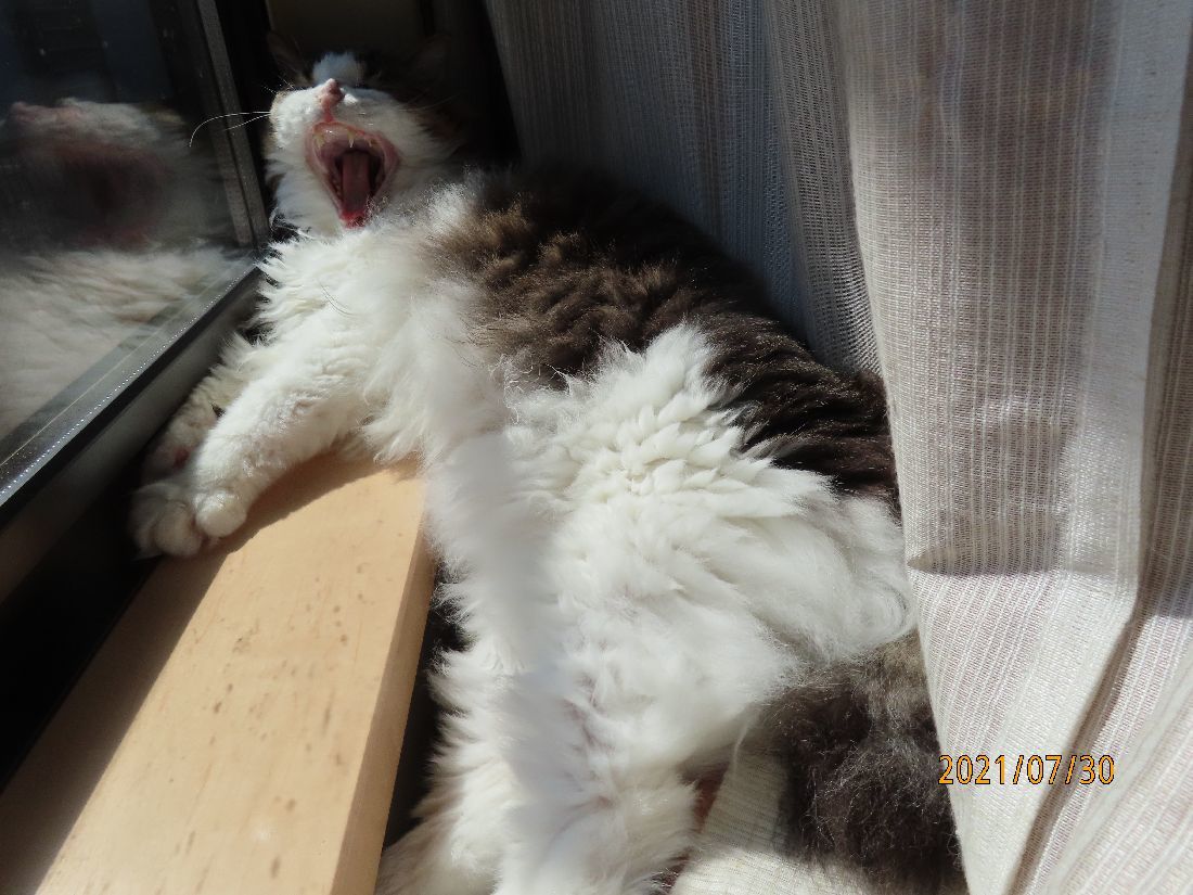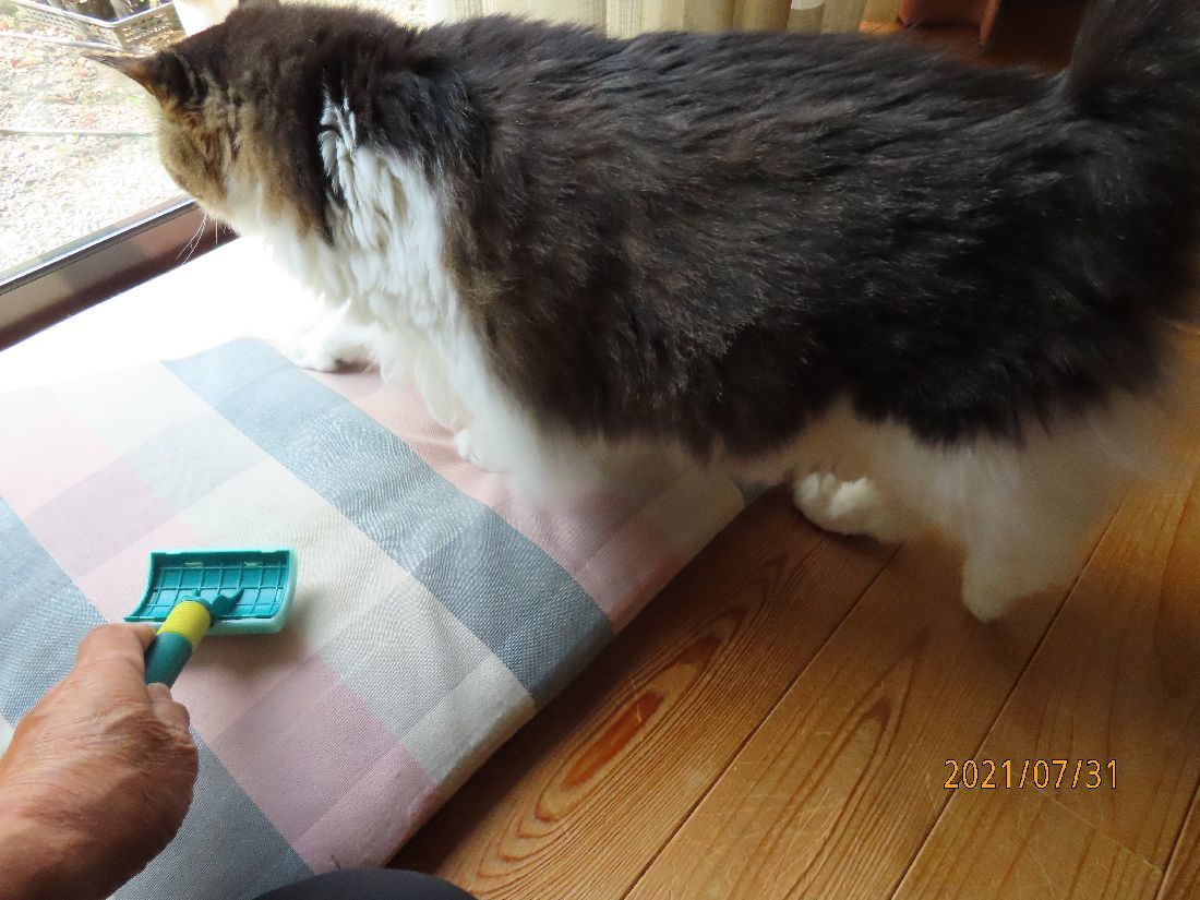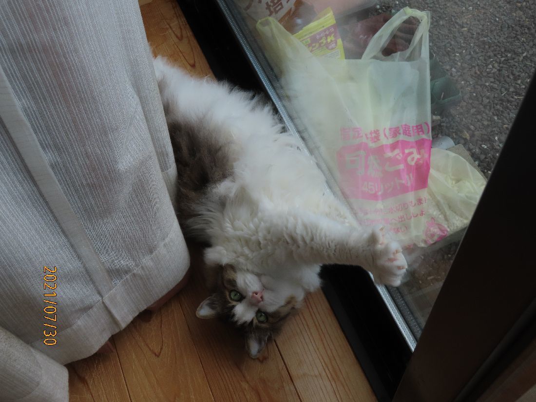ブラッシングが済むとカーテンの陰から外を見ています。