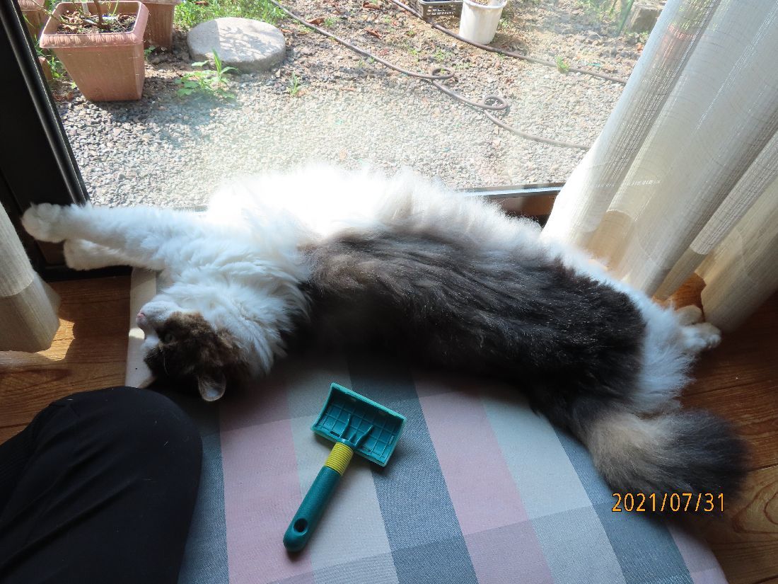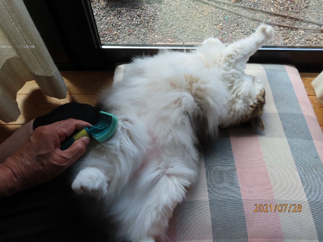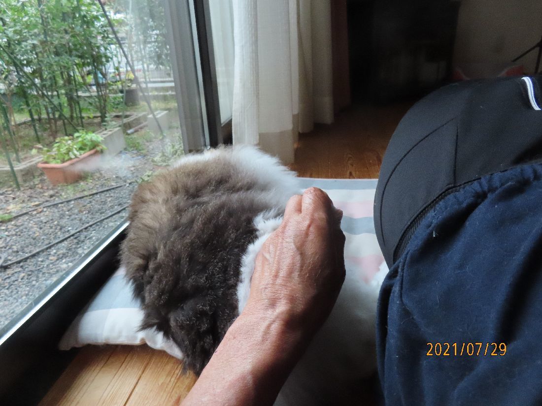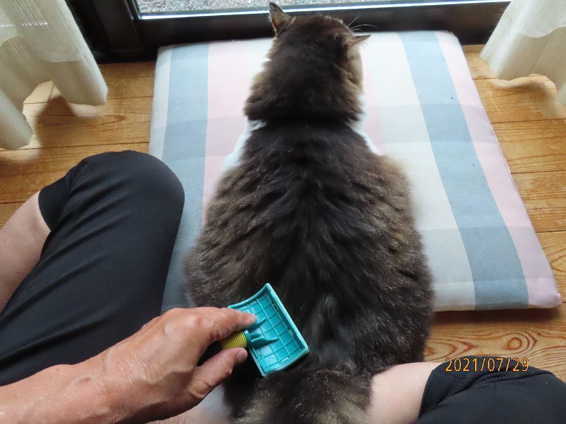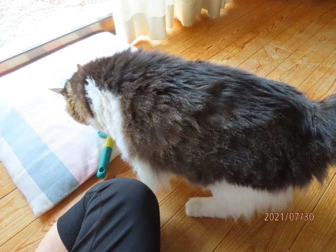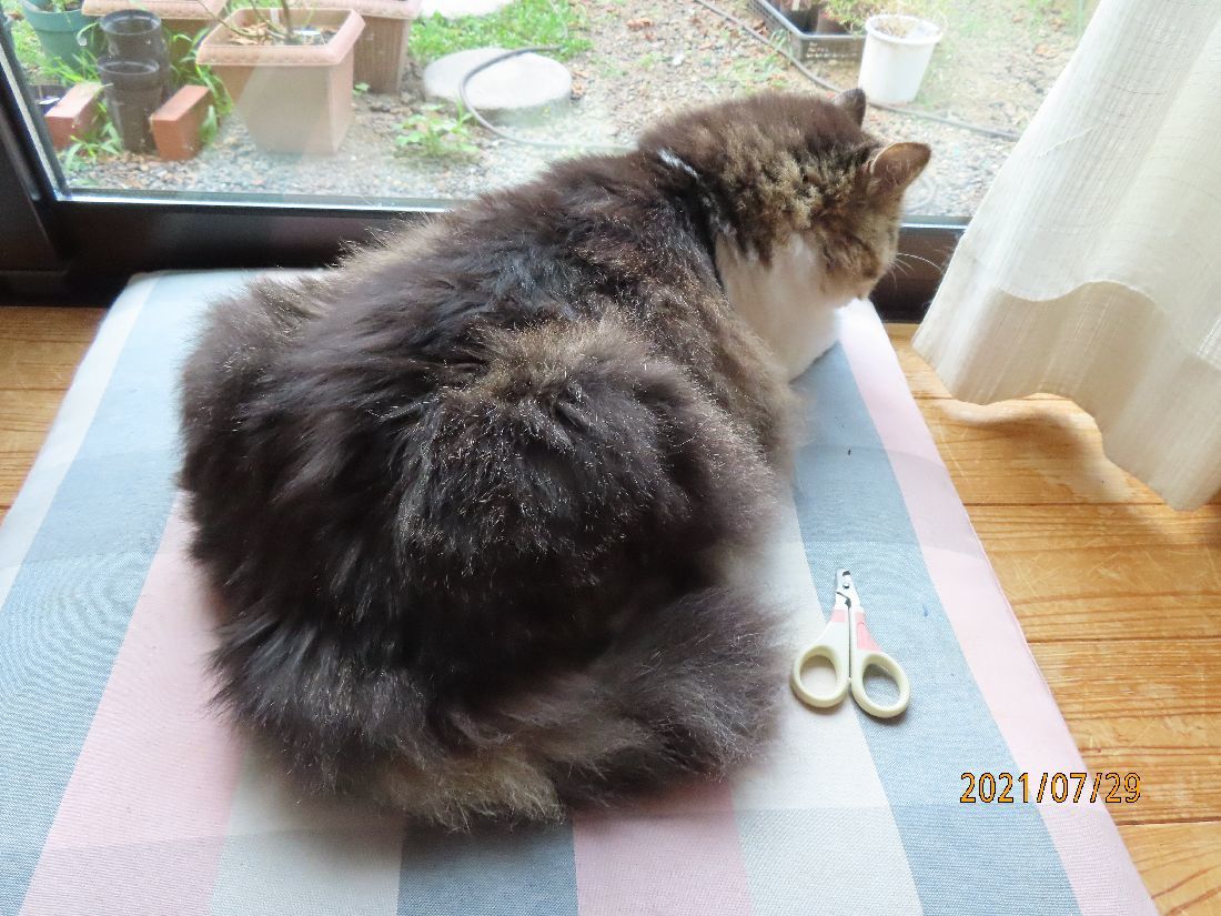 ブラッシングが済むとカーテンの陰から外を見ています。
