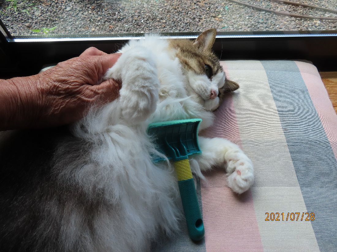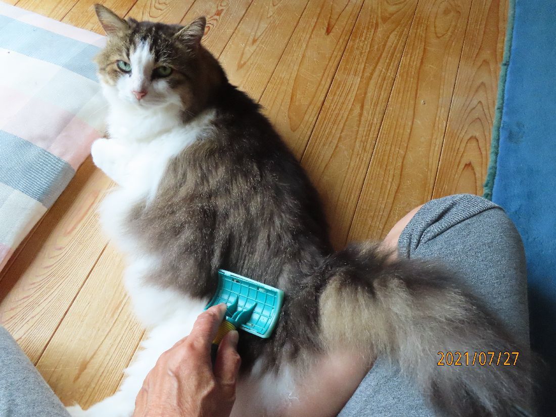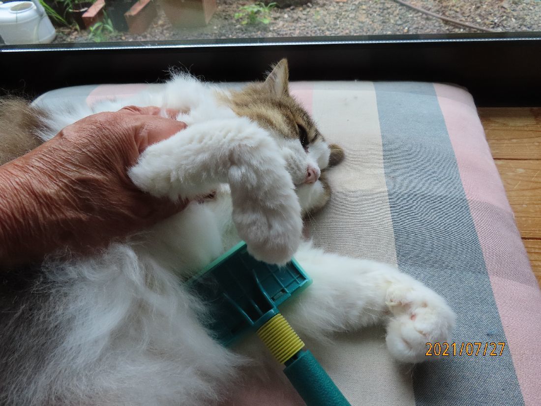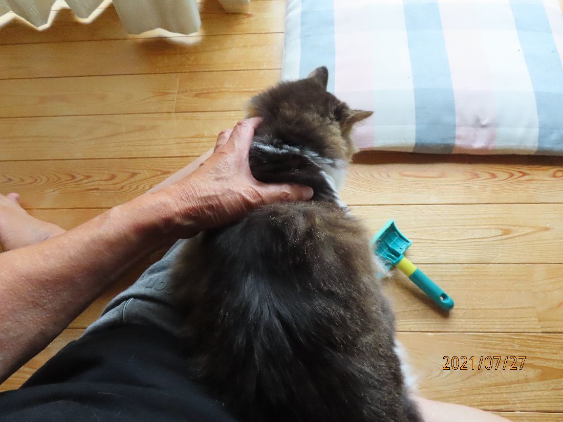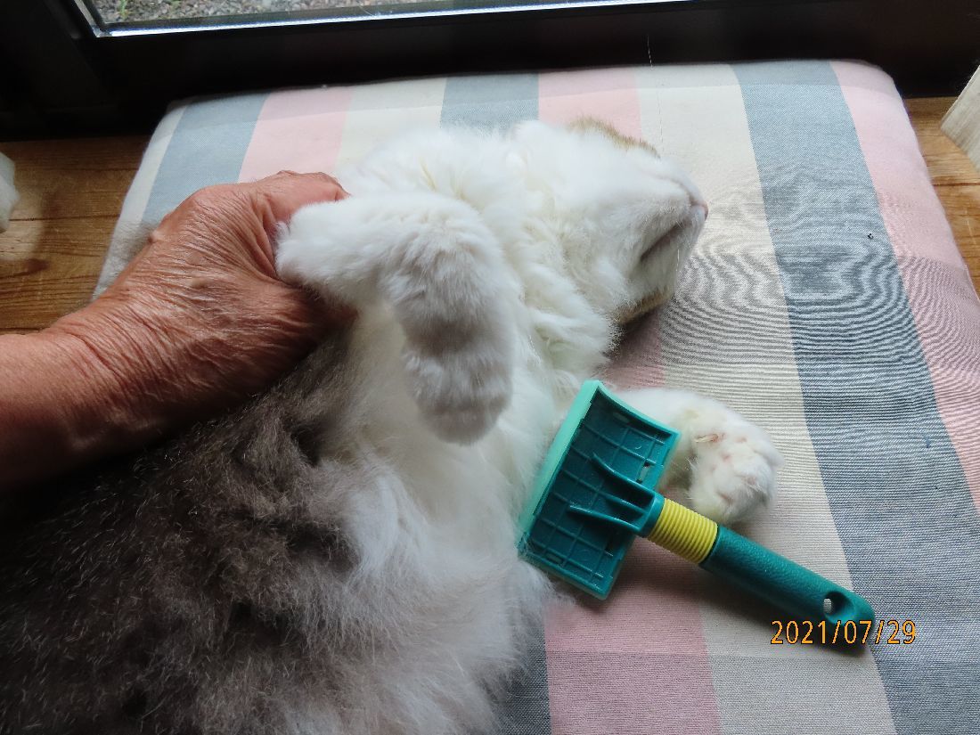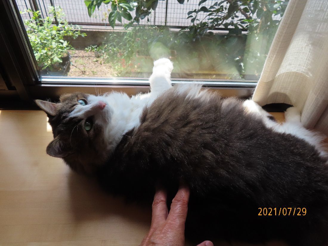 ブラッシングが済むとカーテンの陰から外を見ています。