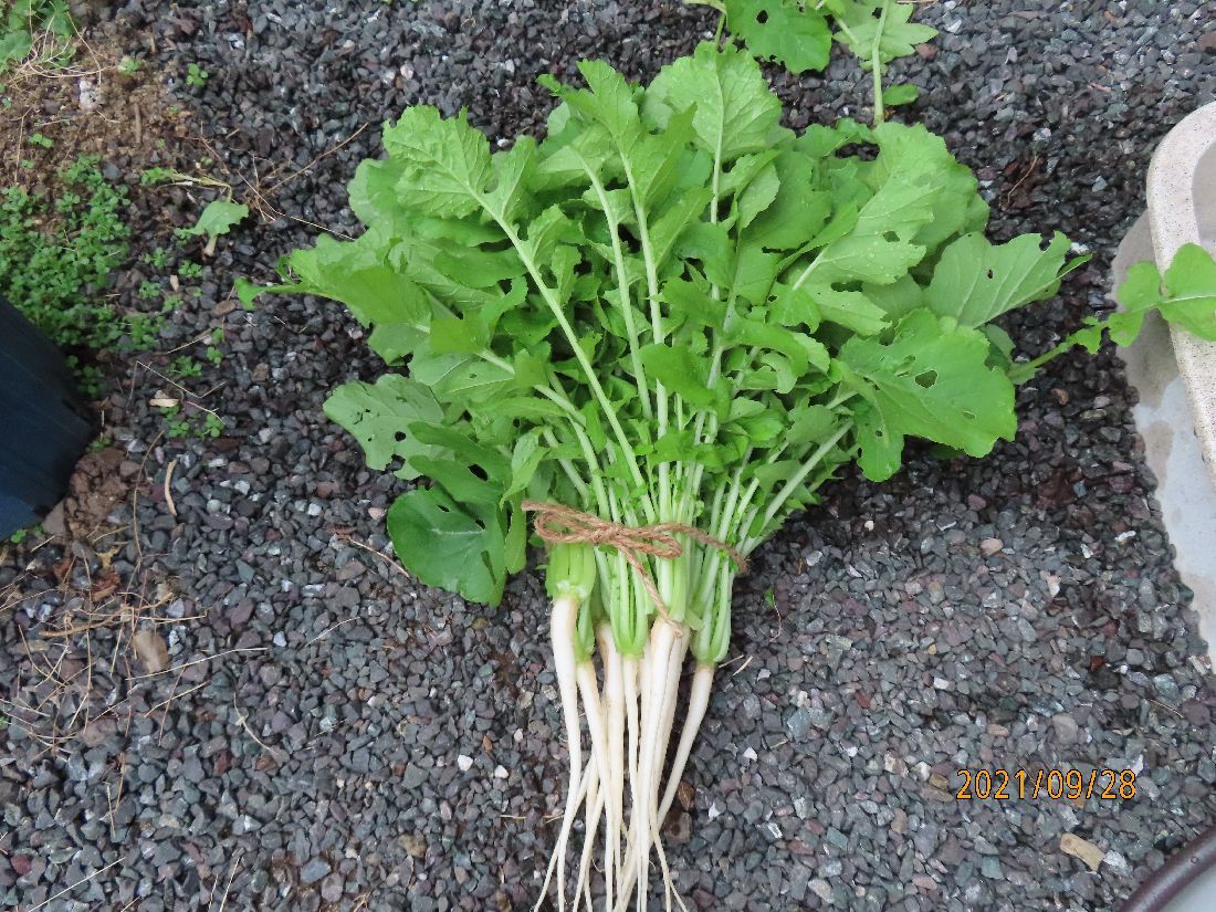 先日の間引きダイコンを浅漬けにしてみます。