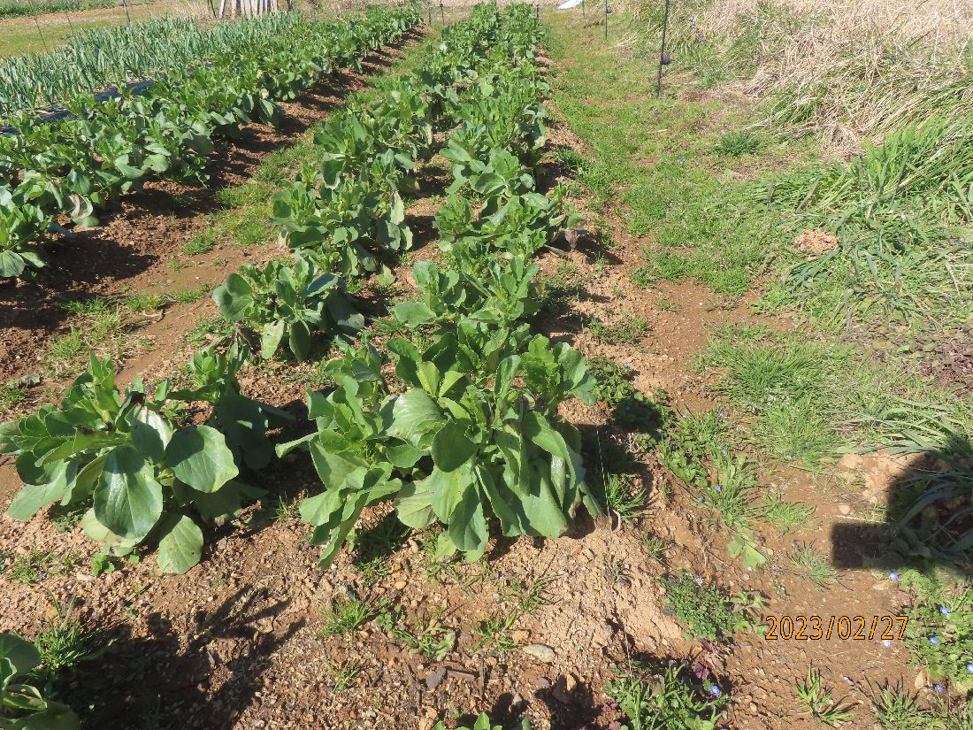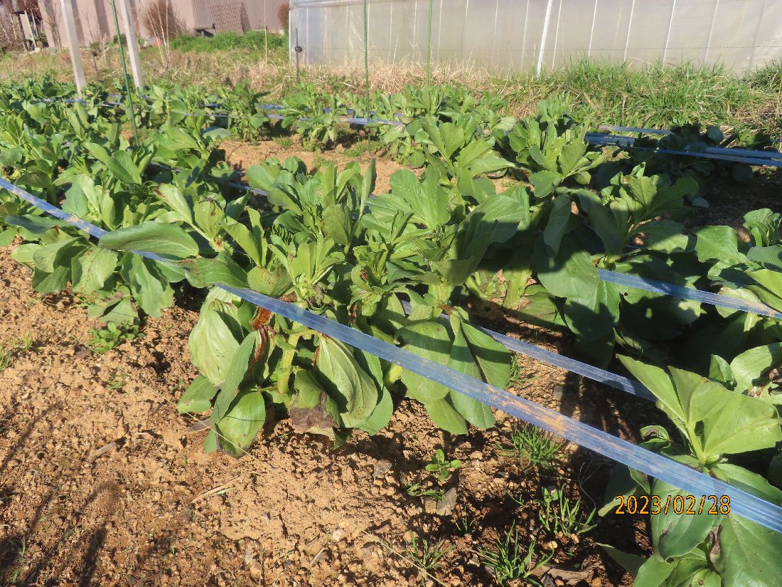 ソラマメの支線を張って誘引仕付けをしました。