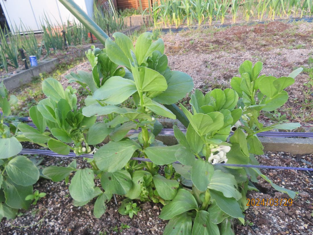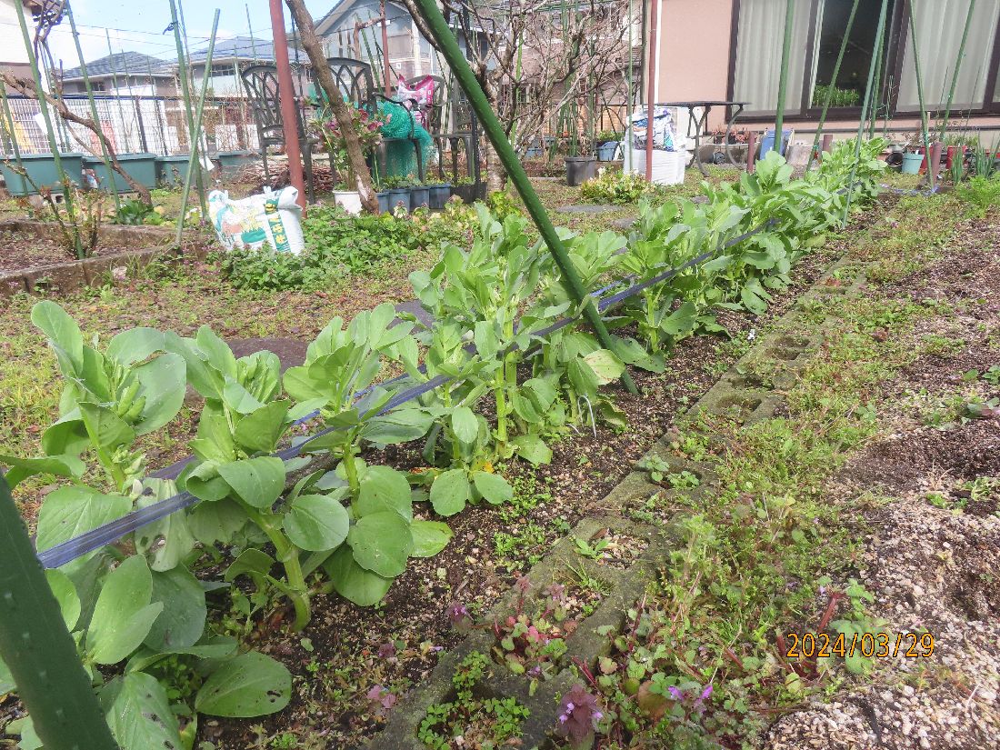昨日仕付けたソラマメはいい感じに立ち上がって伸びてきました。