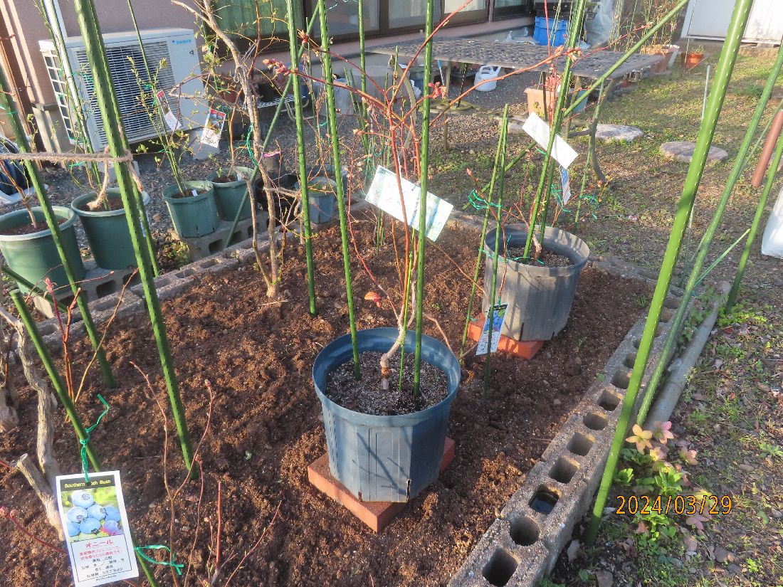10号スリット鉢のスパルタン二鉢は、今年実を生らす予定なので防鳥ネットを張る予定の花壇に入れました。