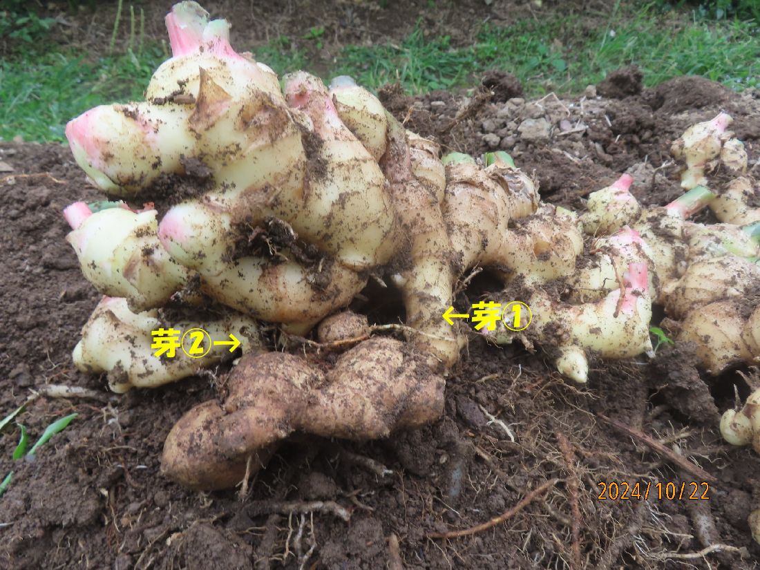種ショウガから出た芽が横へ広がって肥大していきます。