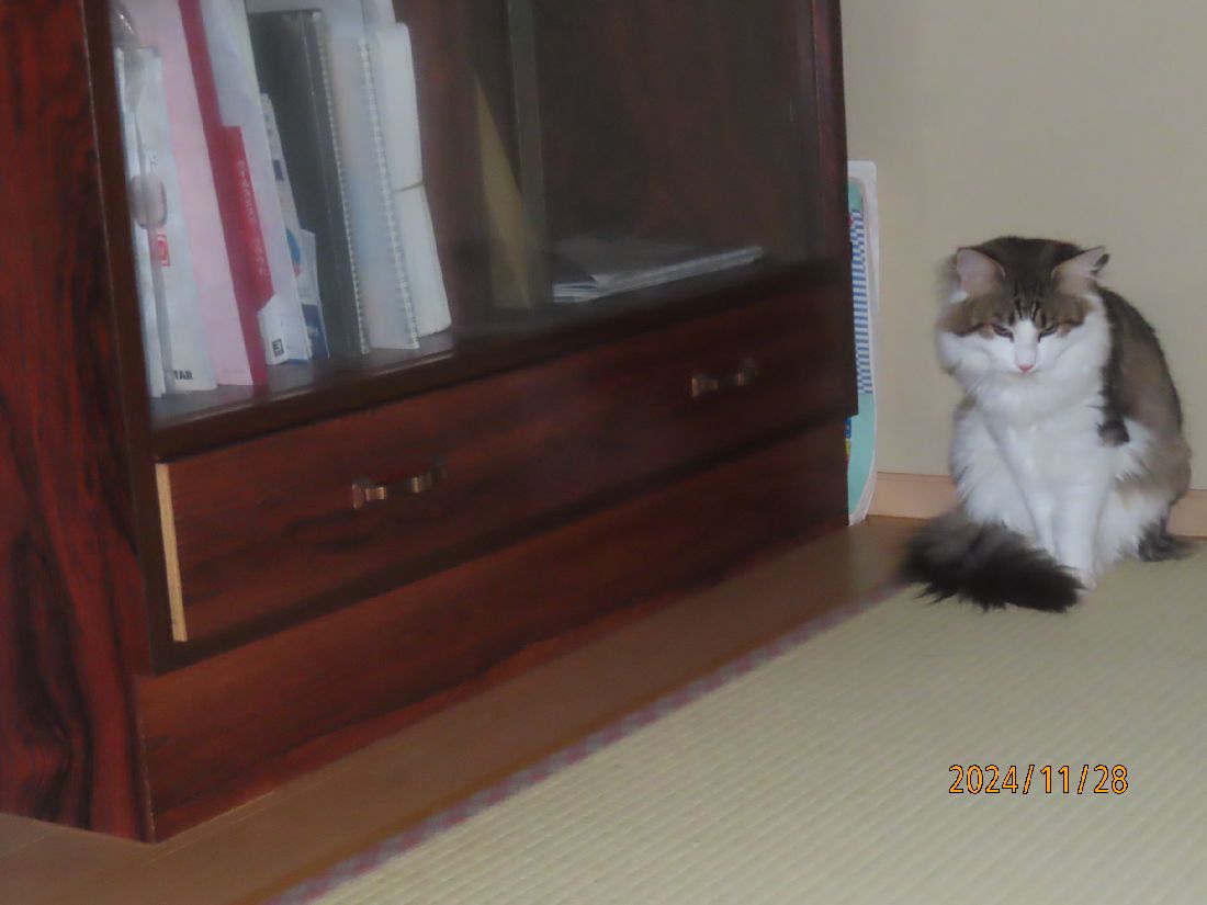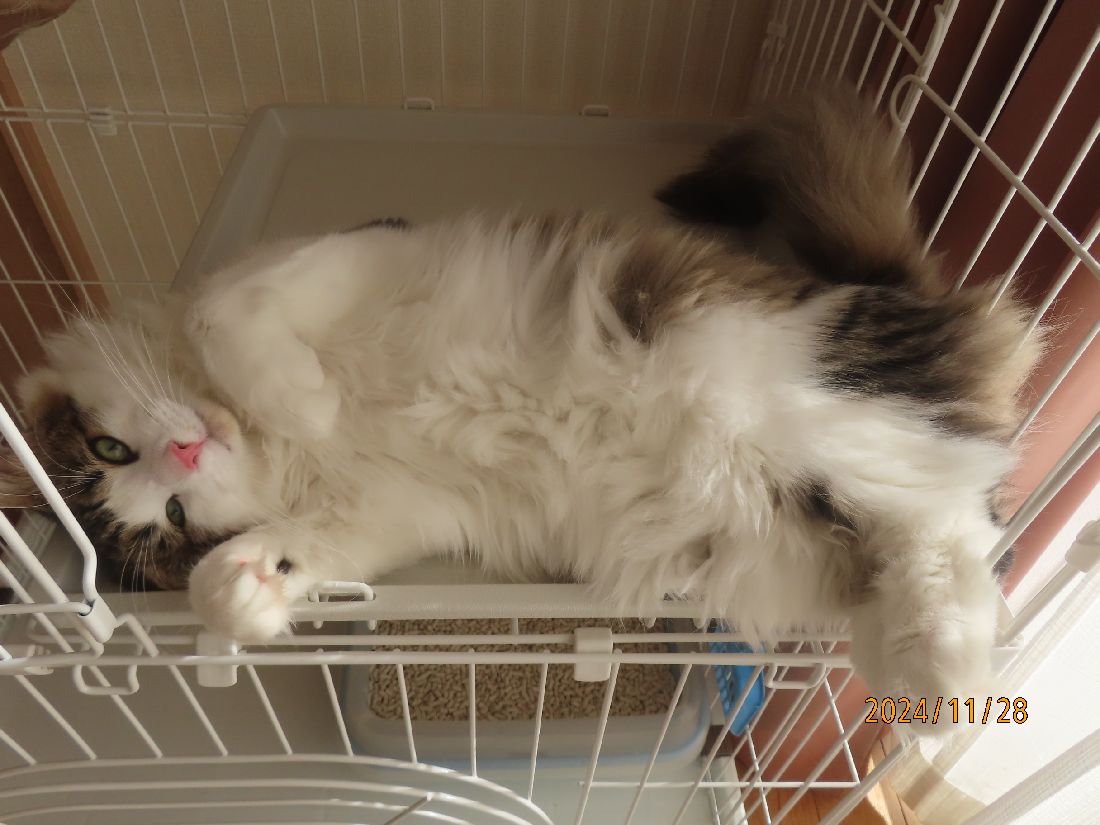 まるの夕食準備でケージに入ってもらうと、フードボウルもウオーターボウルもひっくり返してしまいました。