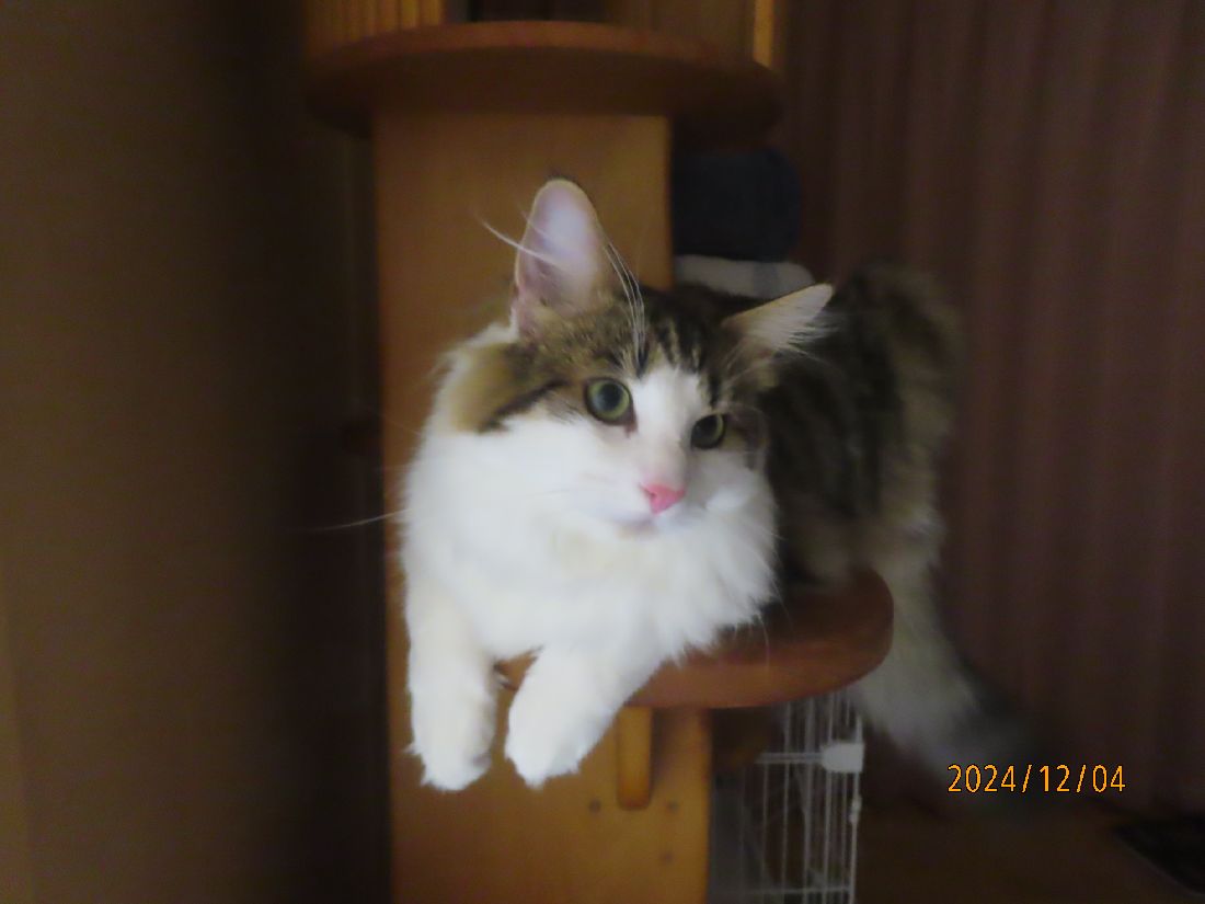 まるは布団に潜りこみますが、さつき君はタワー登り。