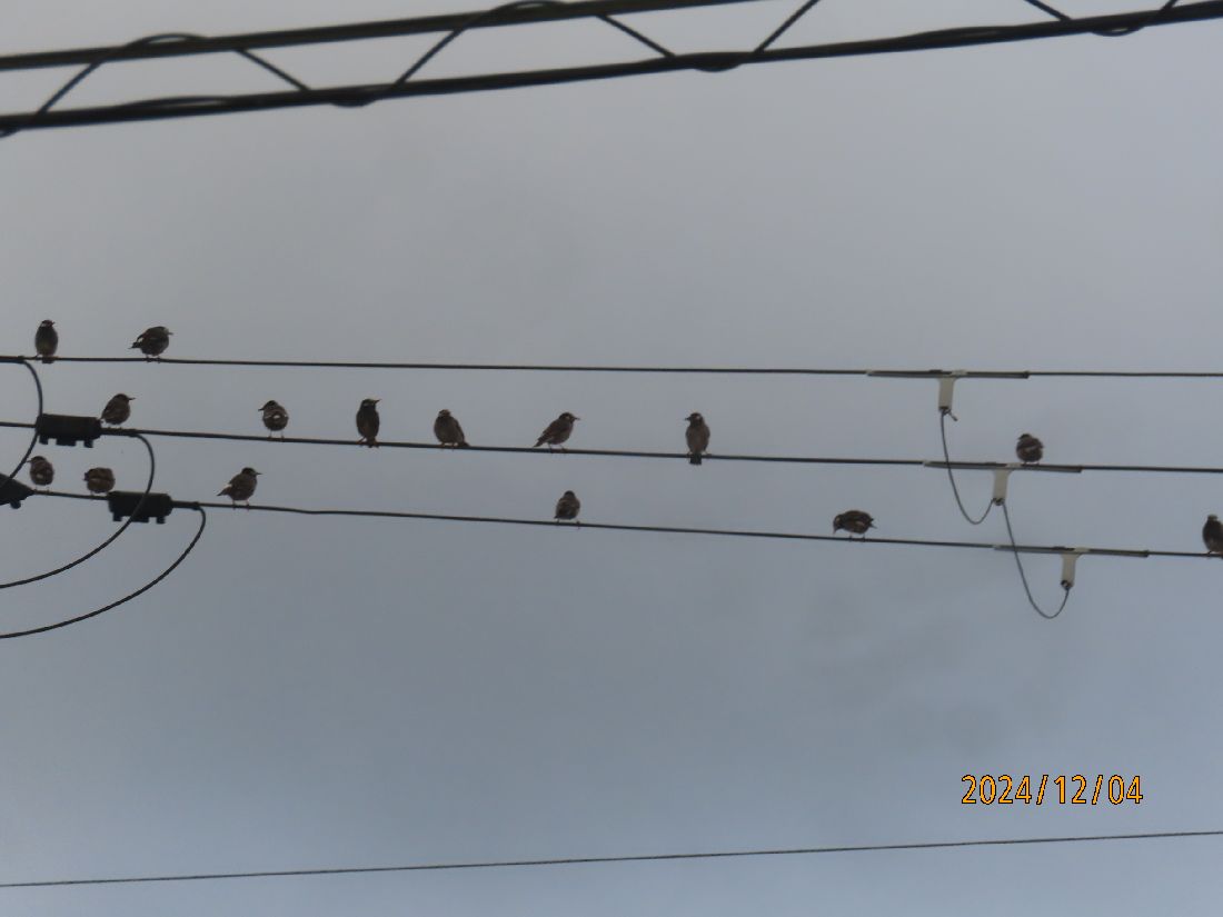 外へ出るとムクドリが飛び立ちました。少し離れた電線に止まっています。