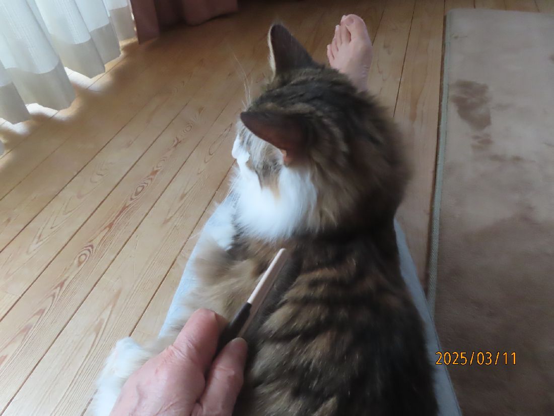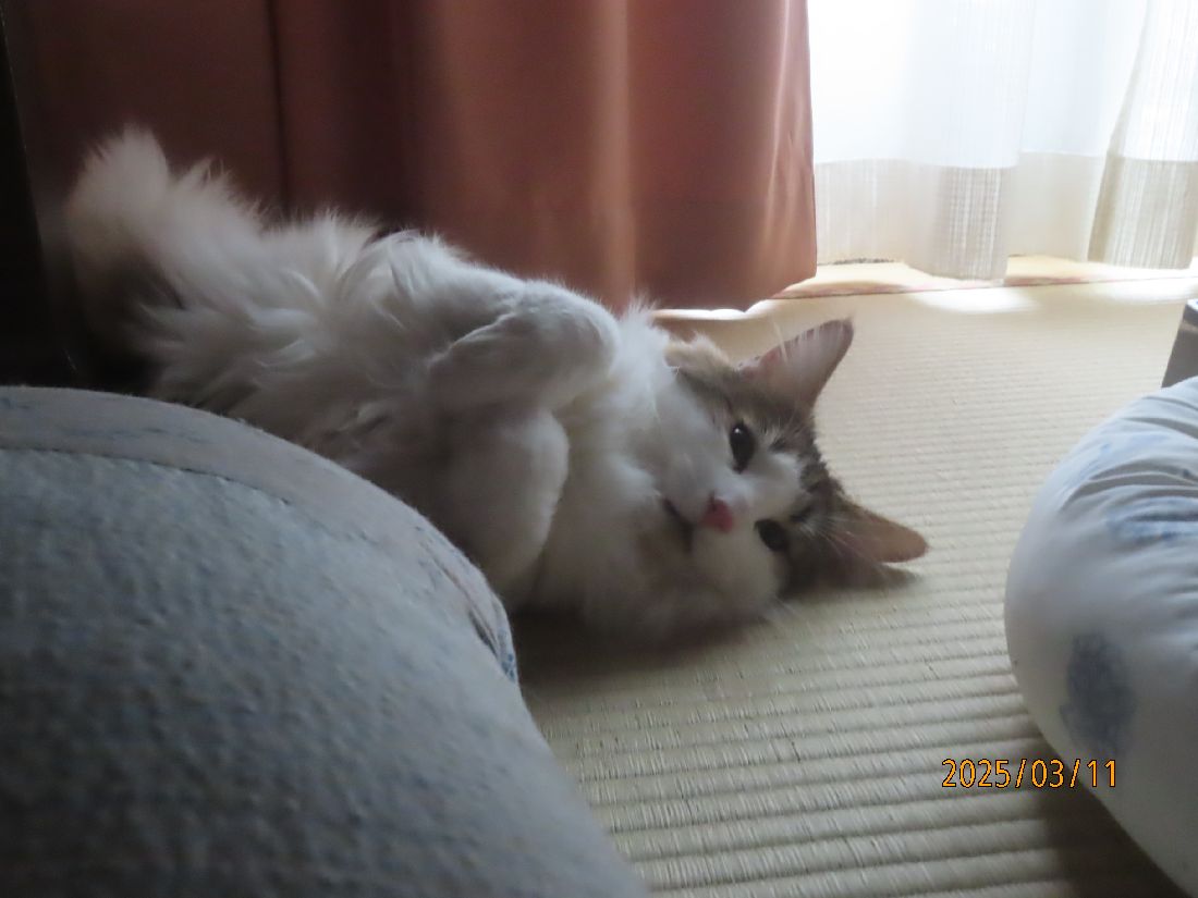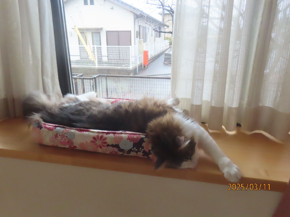 2025年03月11日 雨で予定が狂いました 昨夜のさつき君。寝る前に体重を測ると5.4kgでした。昨夜は特に遊びはありませんでした。五時四十分にトイレに起きました。この夜はトイレ一回でした。朝ゴハンです。ブラッシングです。ブラッシングをしながら爪切りのチャンスを伺います。今日は二本切れました~。ほっこり一休み。出窓でのんびり過ごします。今日は生憎の雨です。天気が良ければ畑でジャガイモの植え付け準備をする予定だったのです。今日の雨でまた土が濡れてしまいました。お昼はおやつに焼きカツオ。お昼寝ですよ。晩ゴハンはたま伝です。焼きカツオもたま伝も大好きのようです。よく食べてくれるのは嬉しいですね。 「その他」カテゴリの最新記事 < 前の記事次の記事 > コメント コメントフォーム 名前 コメント 記事の評価 リセット リセット 顔 星 情報を記憶 コメントを投稿する