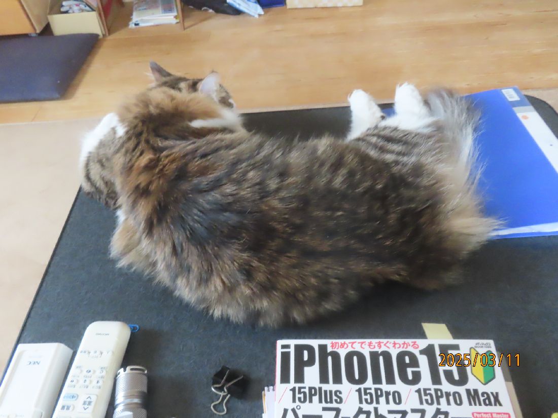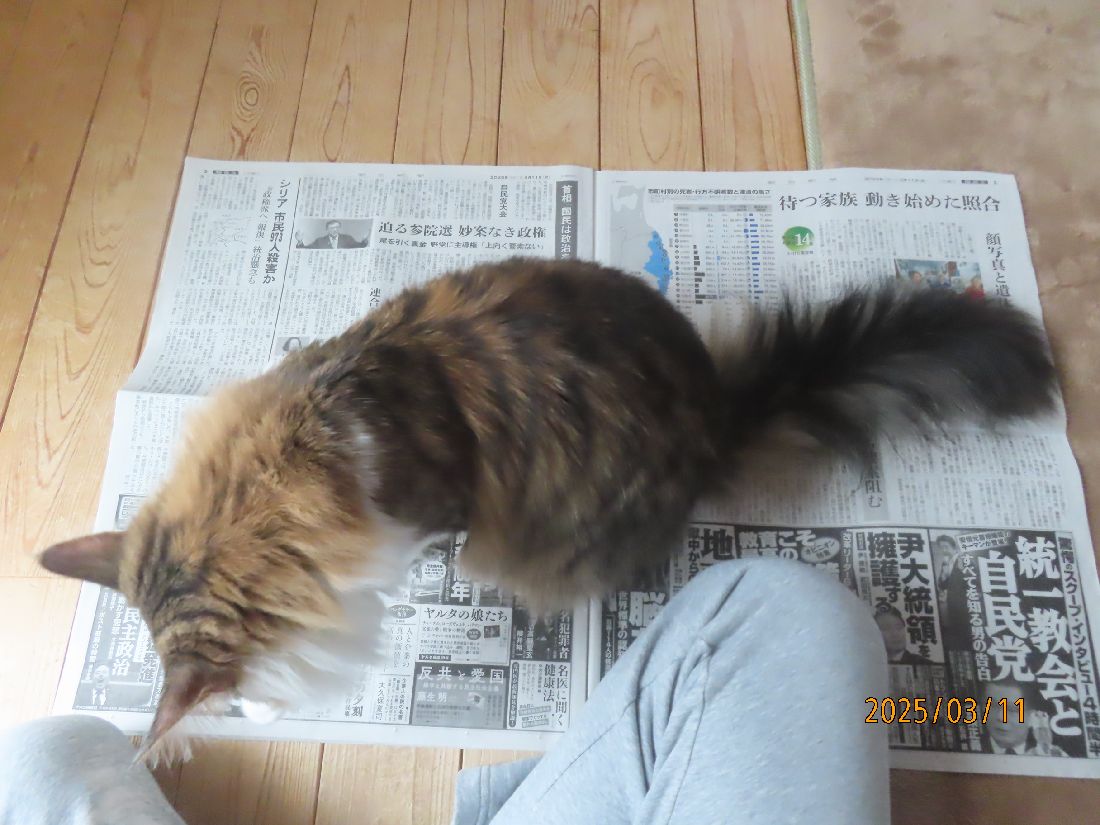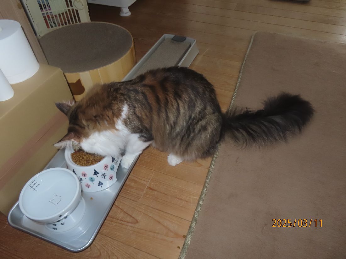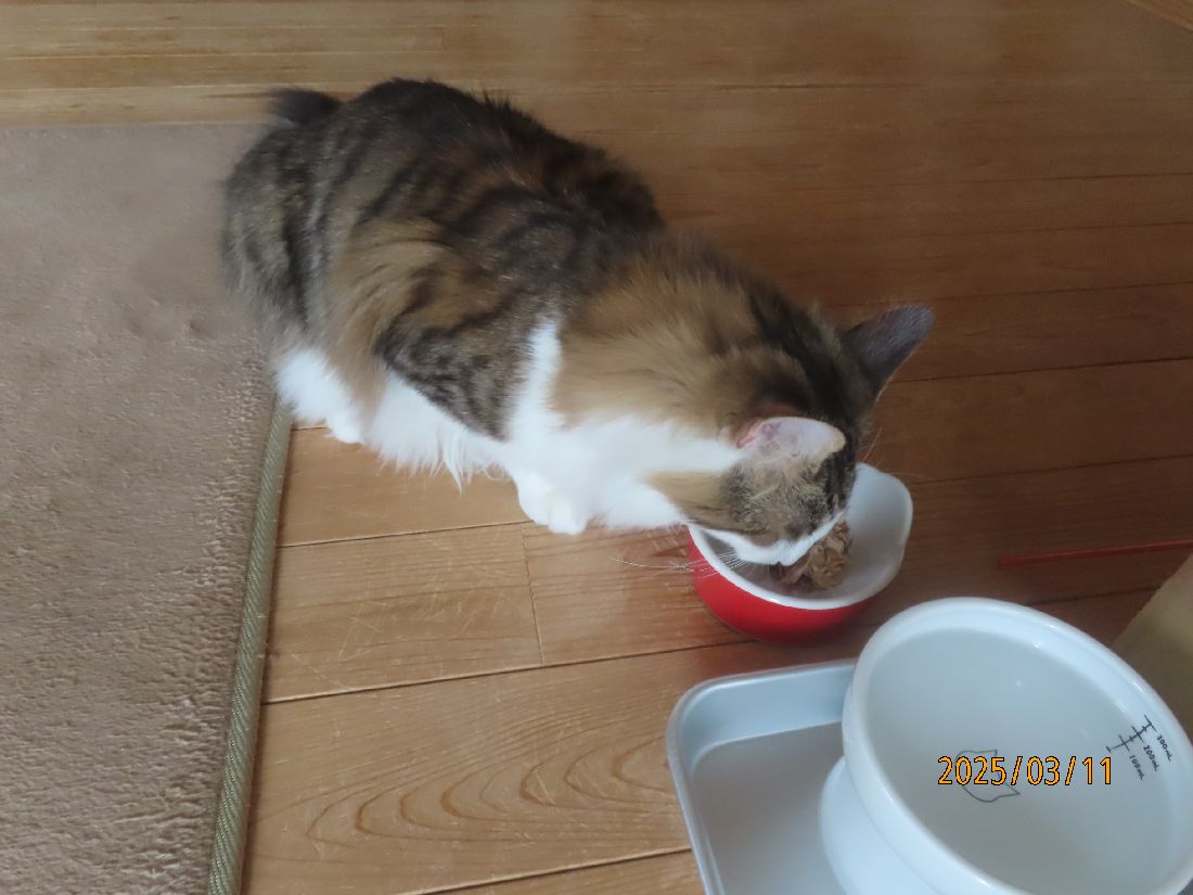 2025年03月11日 雨で予定が狂いました 昨夜のさつき君。寝る前に体重を測ると5.4kgでした。昨夜は特に遊びはありませんでした。五時四十分にトイレに起きました。この夜はトイレ一回でした。朝ゴハンです。ブラッシングです。ブラッシングをしながら爪切りのチャンスを伺います。今日は二本切れました~。ほっこり一休み。出窓でのんびり過ごします。今日は生憎の雨です。天気が良ければ畑でジャガイモの植え付け準備をする予定だったのです。今日の雨でまた土が濡れてしまいました。お昼はおやつに焼きカツオ。お昼寝ですよ。晩ゴハンはたま伝です。焼きカツオもたま伝も大好きのようです。よく食べてくれるのは嬉しいですね。 「その他」カテゴリの最新記事 < 前の記事次の記事 > コメント コメントフォーム 名前 コメント 記事の評価 リセット リセット 顔 星 情報を記憶 コメントを投稿する