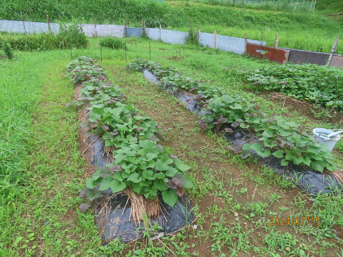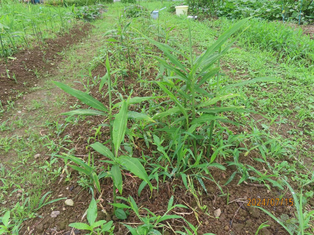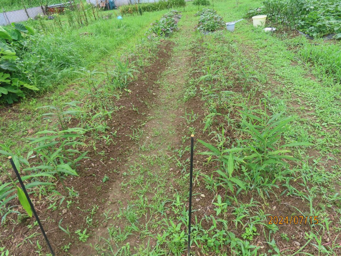 ショウガ畝。先日草引きをしたばかりですが、すぐ雨になってしっり根付いています。